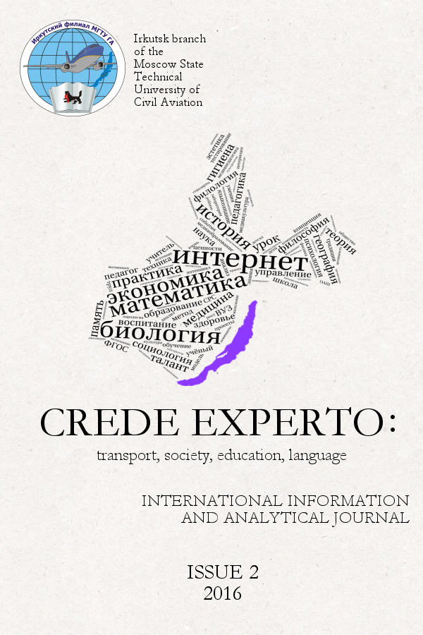 Перед Вами второй выпуск за 2016 год Международного информационно-аналитического журнала «Crede Experto: транспорт, общество, образование, язык» Иркутского филиала федерального государственного бюджетного образовательного учреждения высшего образования «Московский государственный технический университет гражданской авиации» (Иркутский филиала МГТУ ГА). В нём как всегда представлены результаты исследований студентов, магистрантов, аспирантов, молодых и маститых учёных в области транспорта, образования и педагогики, лингвистики.