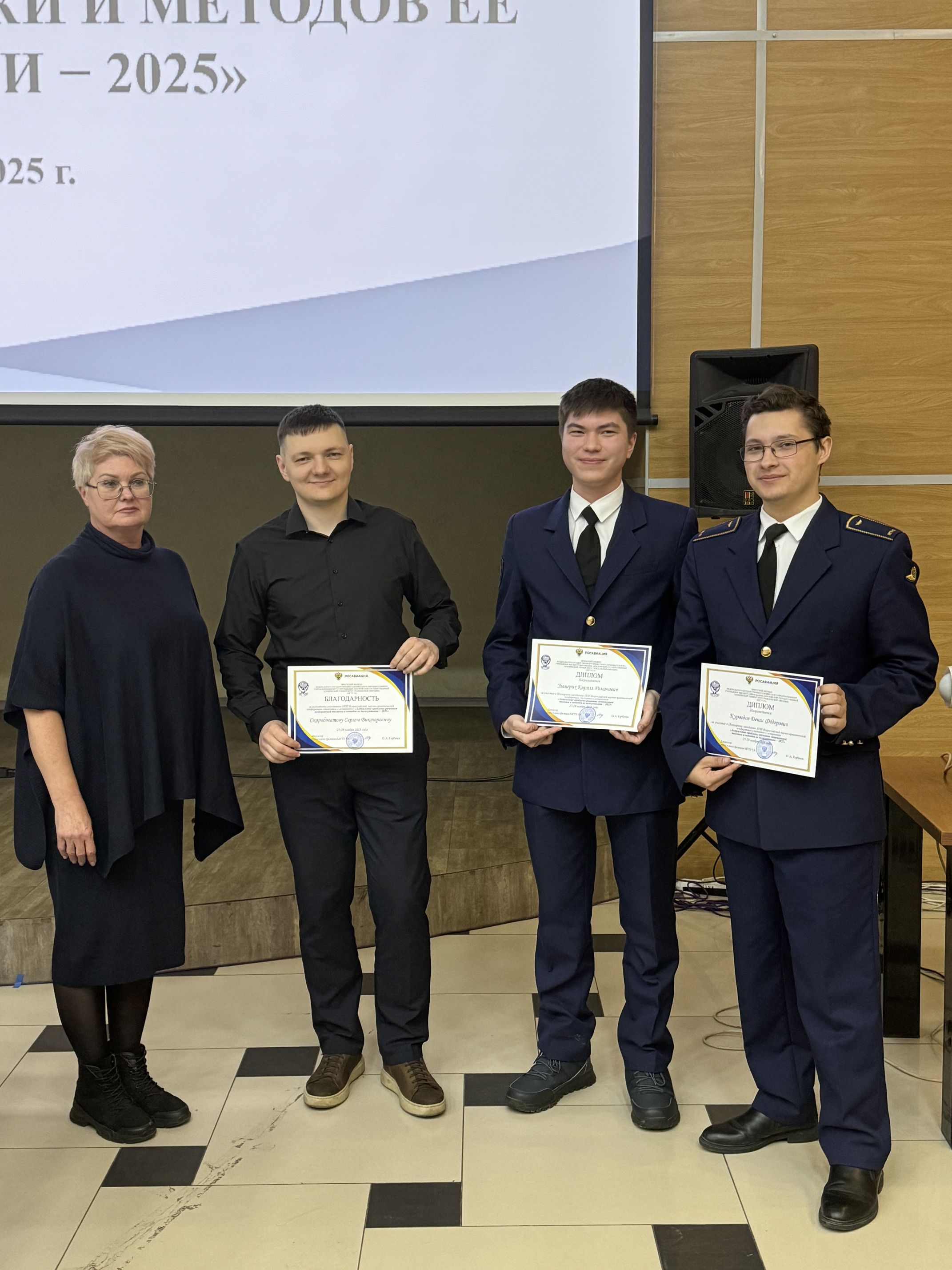 Отчетные материалы в рамках завершения Гранта Ученого совета представили: Шалаев Алексей Александрович (научный руководитель Ерохин Вячеслав Владимирович, доктор техн. наук, доцент), тема: Алгоритмы оценки параметров сигналов радионавигационных систем на основе методов адаптивной фильтрации; Селиверстов Даниил Денисович (научный руководитель Онацкий Александр Николаевич, канд. техн. наук, доцент), тема: Имитационное моделирование сложных систем и процессов гражданской авиации; Кукаркин Константин Владимирович (научный руководитель Котлов Юрий Вячеславович, канд. техн. наук, доцент), тема: Разработка базы знаний интеллектуальной системы АвиаТехПом для диагностики авиационных электросистем и авионики самолета RRJ-95; Коварская Елизавета Игоревна, Данилов Вячеслав Владимирович, Одинец Николай Александрович (научный руководитель Матвиенко Александр Сергеевич, канд. техн. наук, доцент), тема: Разработка установки для демонстрации и исследования предпомпажных и помпажных режимов авиационного газотурбинного двигателя; Куроедов Денис Фёдорович, Эммерих Кирилл Романович (научный руководитель Скоробогатов Сергей Викторович, канд. техн. наук, доцент), тема: Разработка системы компьютерного зрения для беспилотного воздушного судна.