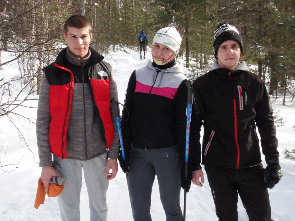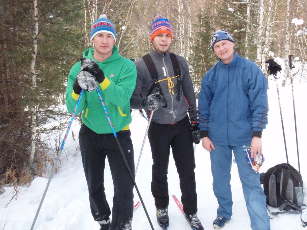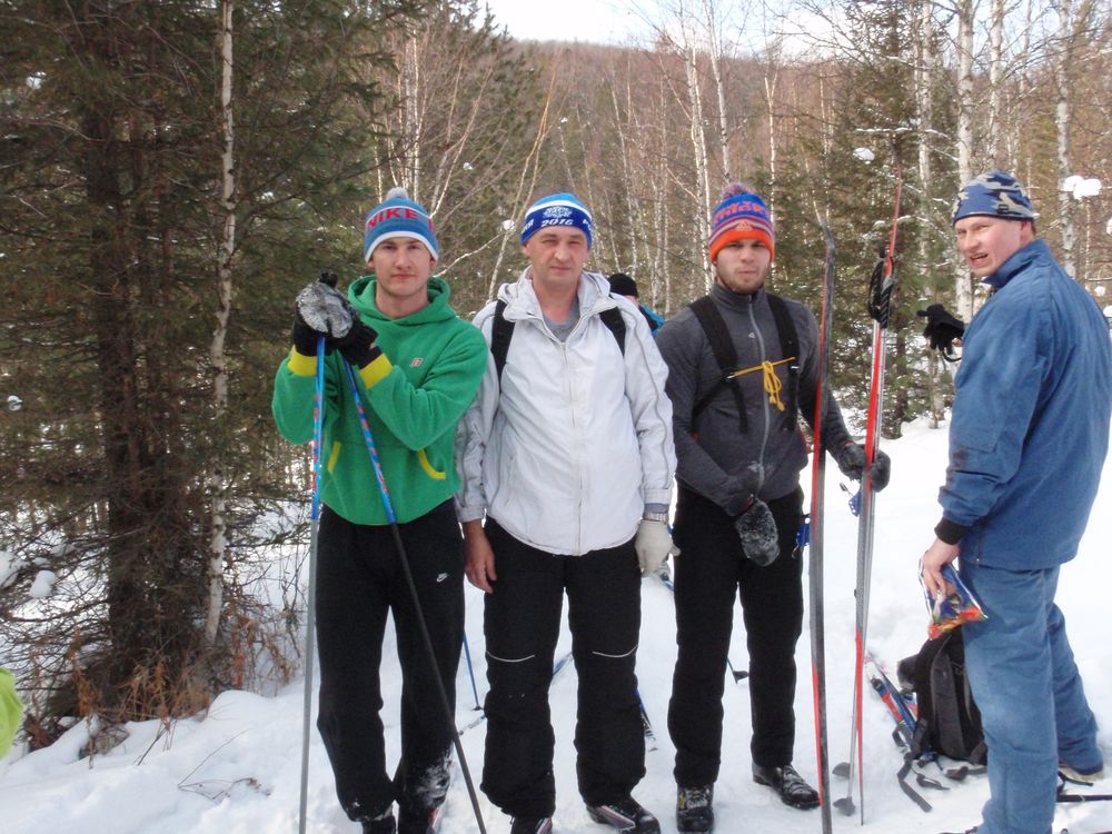 23.02.2016 - студенты 1 курса специальности 25.03.02 Горин И., Цешковский Е., Ломакина Н. и доцент кафедры АЭС и ПНК Кивокурцев А.Л - позади 10 км. по Сибирской тайге